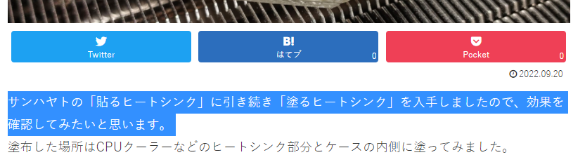 同じく”ヒートシンク”上で3回クリックすると、1段落分の文章が選択されました。この3回クリックで行末まで選択される機能は比較的どのアプリケーションでも共通する振る舞いです。