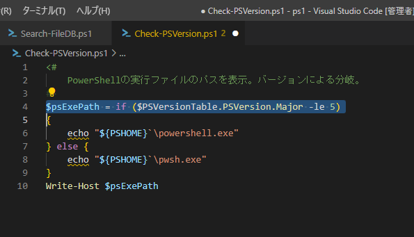 変数の”$psExePath”をダブルクリックすると”psExePath”が選択されます。$などの記号は区切り文字として認識されているようです。