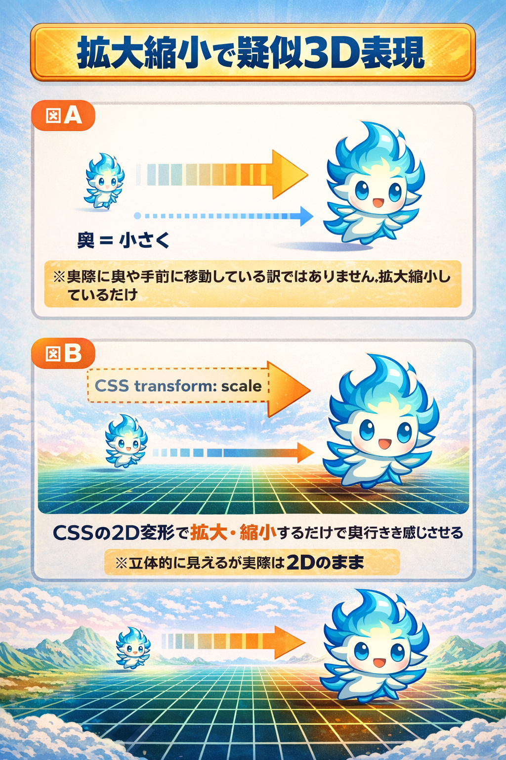 これは実際にZ軸方向へ移動しているわけではなく、あくまで2D変形による視覚的な錯覚ですが、人間の知覚特性により十分に立体的に見せることができます。
