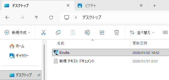 - エクスプローラーは「デスクトップ」と「ピクチャ」の二つのタブが開かれている。
