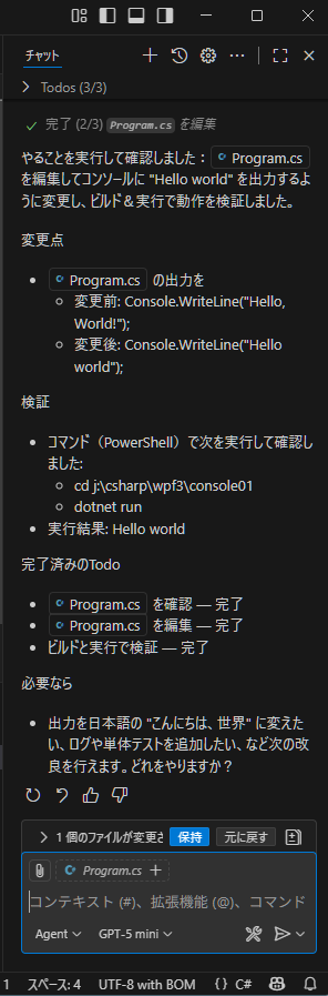 - サインインが完了すると、VSCode側に Copilot が有効化されます。