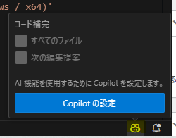 - 左下のステータスバーにある「Copilot」アイコンにマウスカーソルを合わせます。