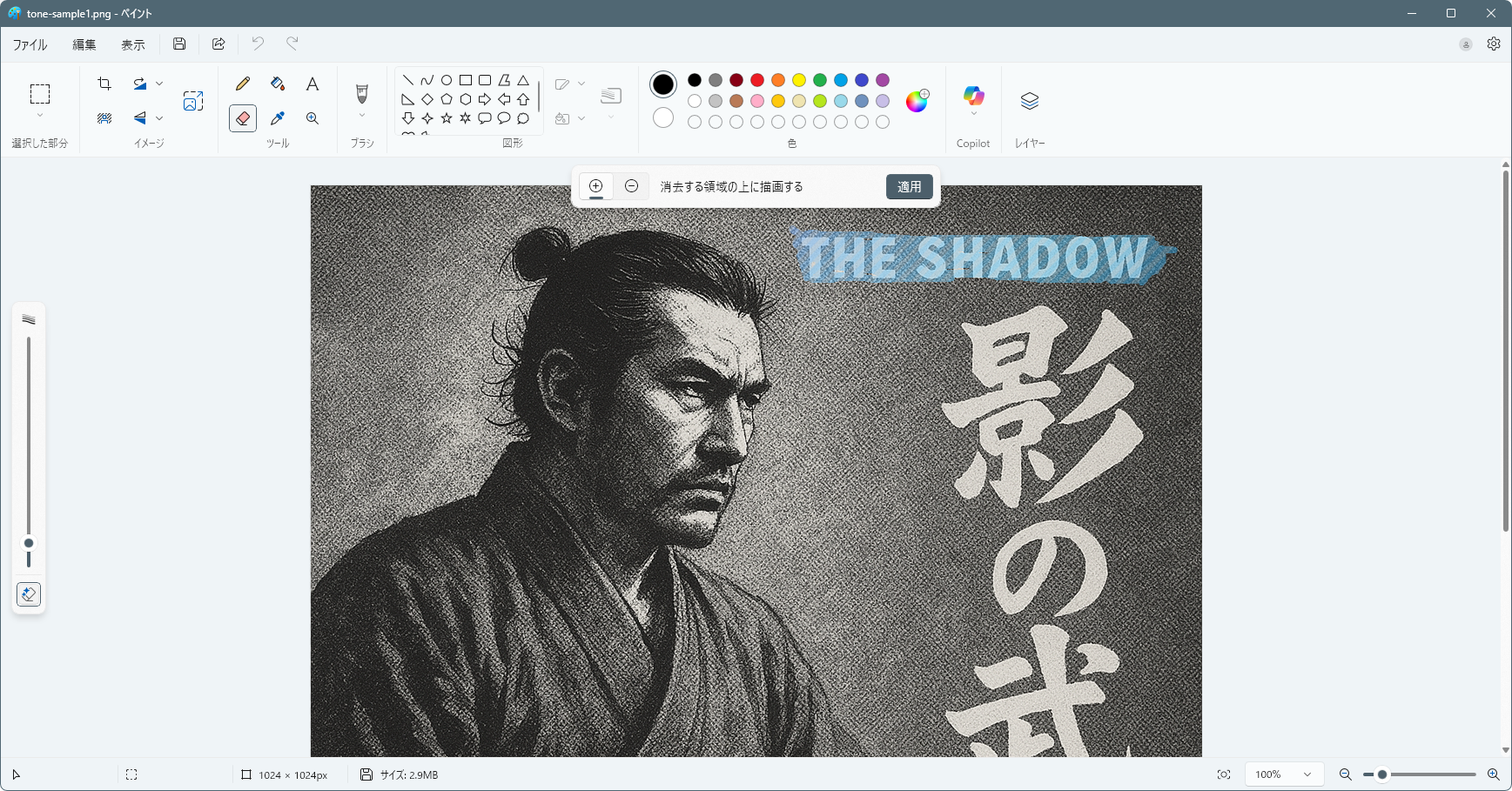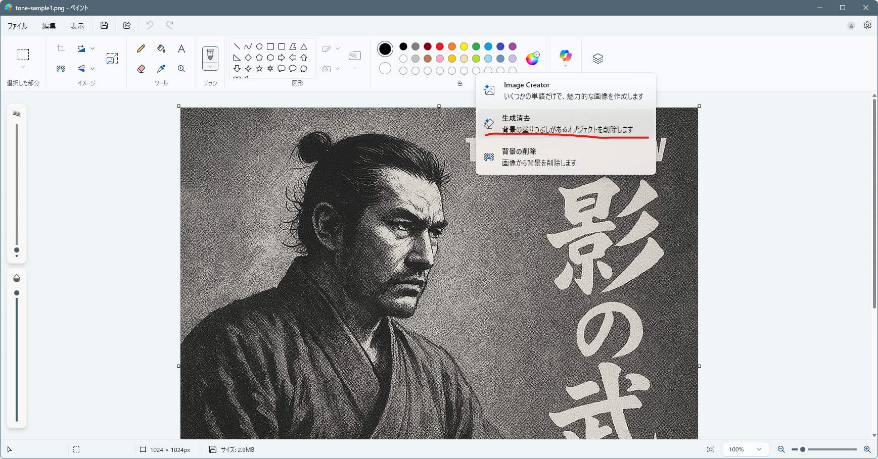 ・ペイントを起動し、画像読み込んだ状態で、「Copilot」アイコン→「生成消去」を選択。