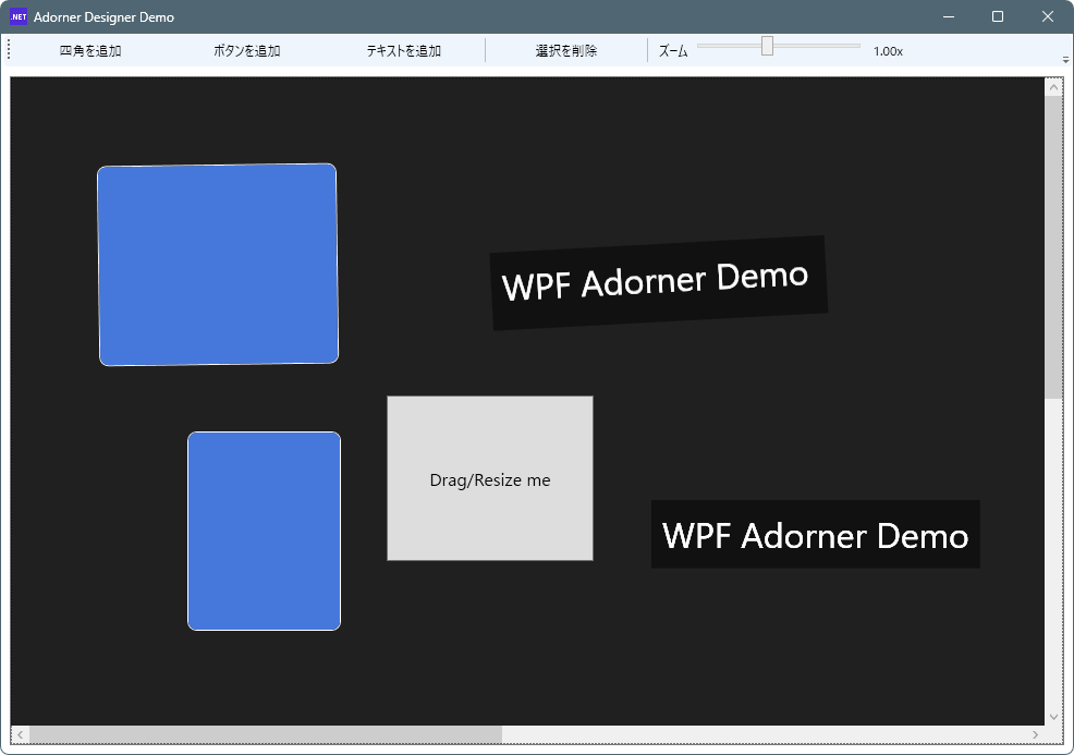 これにより、WPF 上で簡易的な「デザイン編集 UI」や「配置・調整インターフェイス」を手軽に実装できます。