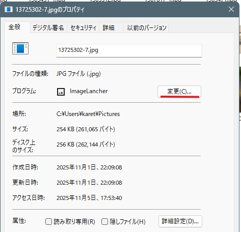- エクスプローラー→jpgファイルで右クリッリック→プロパティ