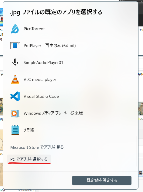 - PCでアプリを選択する→関連付けたいアプリの実行ファイルを選択