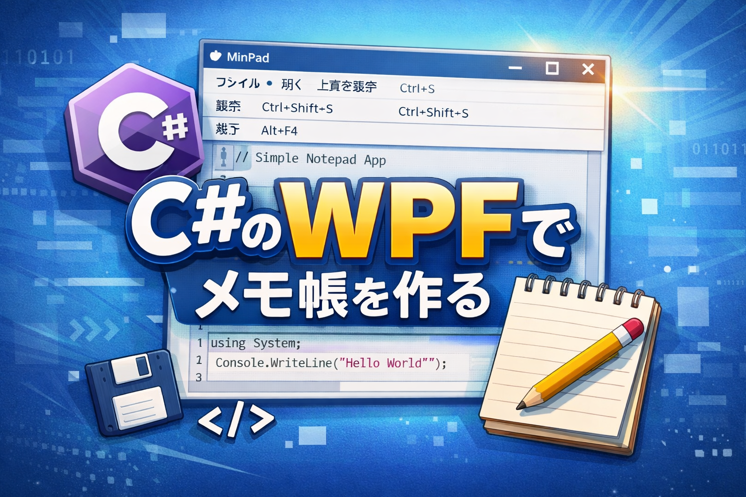 WPFのコードビハインドでアプリを作る基本形としてシンプルなメモ帳を作成しました。